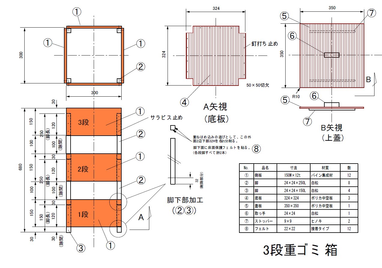 3段ゴミ箱・猫グッズなどDIYしてみました。 組立図を添付したものもあります。面白いと思われたら作ってみてください。 3段重ゴミ箱 ゴミ箱にスペースを取られるのは嫌なので3段重ねのゴミ箱を作ってみました。 各段にレジ袋を装着し、例えば下から紙ゴミ・プラゴミ、最上段は蓋付きなので生ゴミ用とします。 ゴミ捨ての時は各段はずして処分、再装着します。