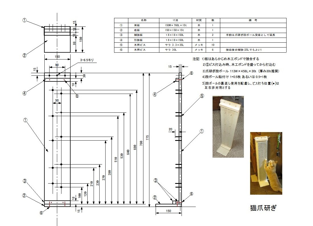 猫爪研ぎ器 縦形の爪研ぎ器を作ってみました。柱で爪研ぎしたがる猫にいいと思います。飛び出たネジに爪研 ぎ段ボールを差して装着、縦置きでもしっかり固定できます。ペース板を付けたので柱の横などに自 立できます。上部のバー・穴は不安定な場合の固定用です。写真では差込み用ネジ位置が左右対 称になっていますが、段ボールの裏表交換を考えると非対称にすべきでした(図面は変更済)。
