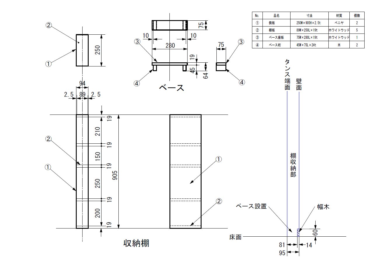 隙間収納棚 幅95mmの隙間を有効利用すべく製作しました。壁下の幅木を避けるためベースを追加。 使ってみると棚奥に収納物停止用のバーが必要でした。 隙間収納棚(組立図)クローゼット収納棚 ホワイトウッドで枠組みを作り、スノコ(購入品)で収納物を受ける考え方です。 クローゼットと使うスノコのサイズを確認したうえで棚の設計に入りました。 ドア側の出し入れ口には底部に段差ができないよう配慮しています。 購入品ではぴったりサイズの棚が見つからず、家内で好評です。
