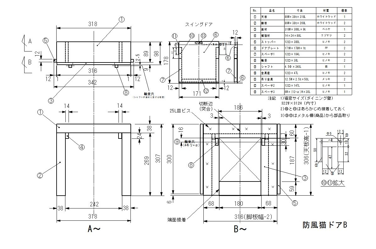猫ドア1 猫用屋外出入口に設置している猫ドアです。出入口(322W×313H×80D<差込み深さ>)にはスイング タイプの外壁ドアが既設ですが、開けると風が吹き込む問題がありました。 市販の猫ドアをはめ込んだ開口部の小さいボックスを作ってみました(猫ドアA)、防風効果顕著です。 猫に好みがあるかとドア自作タイプ(猫ドアB)も作ってみました。 慣れるのに1〜2日かかりましたが、どちらのタイプも今はダッシュで通り抜けています。強風雨時は引 き出して外壁ドアをロックします。