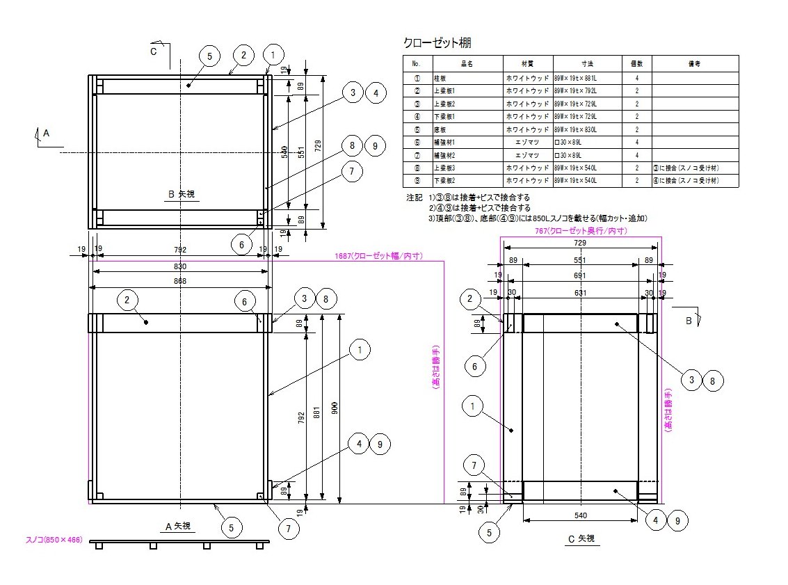 隙間収納棚 幅95mmの隙間を有効利用すべく製作しました。壁下の幅木を避けるためベースを追加。 使ってみると棚奥に収納物停止用のバーが必要でした。 隙間収納棚(組立図)クローゼット収納棚 ホワイトウッドで枠組みを作り、スノコ(購入品)で収納物を受ける考え方です。 クローゼットと使うスノコのサイズを確認したうえで棚の設計に入りました。 ドア側の出し入れ口には底部に段差ができないよう配慮しています。 購入品ではぴったりサイズの棚が見つからず、家内で好評です。