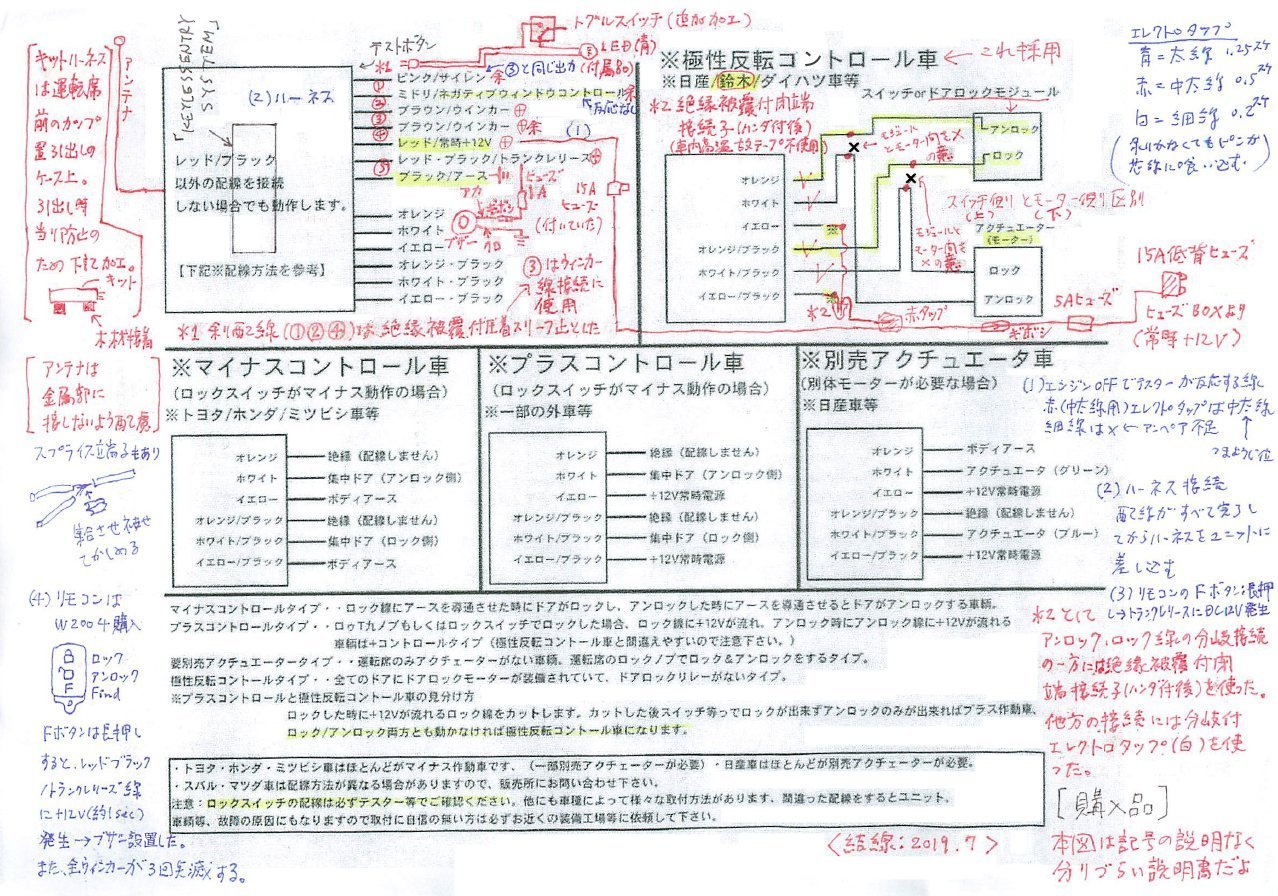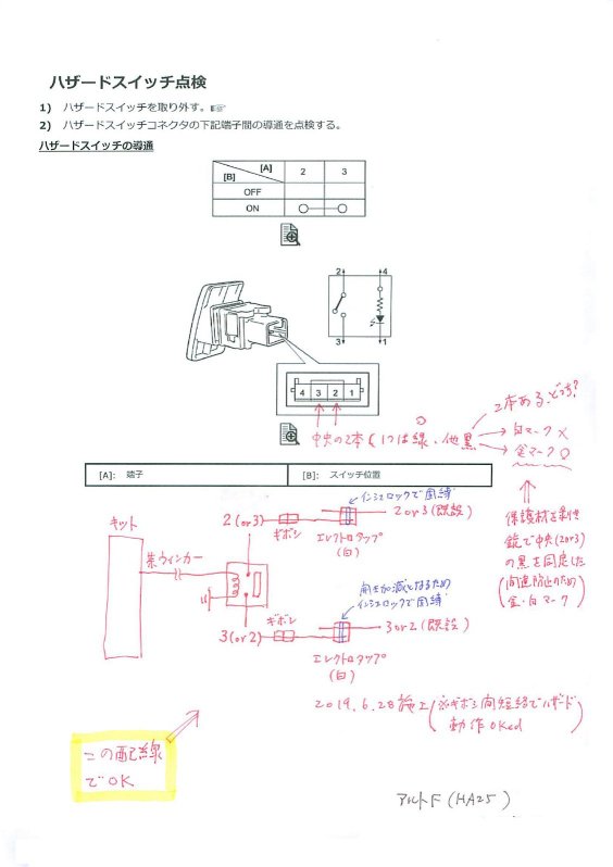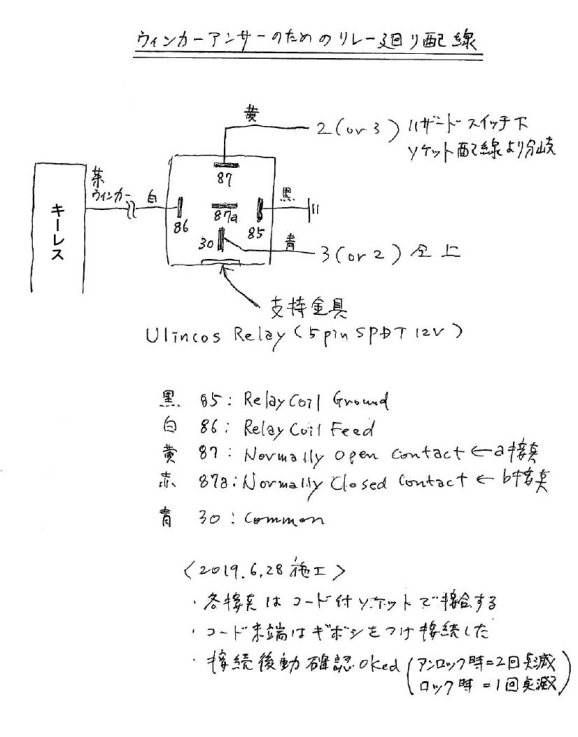 猫トイレはこれがいい ボックスタイプというべきか写真(左1・2)のトイレは清潔でメンテナンスも簡単です。 開放型の浅いバットタイプだとおしっこ部分をきちんと分けづらいですが、本器は傾けるとサラサラ部分と おしっこ部分が分離できます。 かたまりをスコップですくい取れば残りに汚物が混じりません。トイレの壁が高いから可能なんですね。 密室感もあり恥ずかしがりの猫は気に入ると思います。2020.5 …月日が流れ猫さんも16歳、ボックスタイプに跳び上がるのがしんどそう。またいで入れるタイプに変更 しました。こちらは砂が指の間に挟まったまま出てくるので、ほぼ毎回砂集めの床掃除です。2025.2 ![]() ![]() ![]() FRIXION PILOTのFRIXIONを愛用していますが、最近0.4mmタイプが出ました。本体もややシャープになり書きやす いです。2020.4 ![]() プロジェクタ時計 就寝中うっすら眼を開けると天井に時刻が見える・・・なまけ者にはいいですよ。 写真のものは気温も表示します。青色表示のものもありますが視力の弱い筆者にはやや鮮明度不足でした。 2020.4 ![]() ![]() キーレスを取付けてみた キーレスエントリーシステムキット(リモコン付き2680円)を購入、アルトFに取り付けました。 もともとキーレス車なんだけど、中古車のためキーレスのリモコンの一つが損傷し予備がない状態でした。 購入キットの取説は簡略すぎて配線解読に難渋しましたが、スズキに端子図もらったりして何とか取り付け。 キット本体は運転席カップ受け引き出し裏に収納しました。 取り付け作業にはDC12V検電テスター(440円)が必要です。追加部品としてDC12Vリレー(5極/ab2接点切替 968円)を購入。これはウィンカーへのフラッシング出力を中継するa接点として使いました。 取り付け後、純正・追加キーレスとも正常に動作しています。 ロック状態を知らせるLED(点滅)をON/OFFスイッチとともに運転席(前照灯角度調整横)に取付けました。 リモコンのFボタンを長押しするとトランクレリース端子にDC12Vが印加されます。これにDCブザーを接続しまし た。ブザーは車がここにあるよと知らせるためのものでしたが、運転席に取り付けたのでは外に音は聞こえませ んでした。エンジンルームにブザーを置くと聞こえる音量ですが、配線の取り出しが面倒なので止めました。 ロック状態を知らせるLEDとFボタンブザーは特に取り付ける意味はないですね。 2019.6 キーレスキット配線要領 キーレスエントリーシステムキットロック・アンロック線接続 ロック・アンロック線 ウィンカーアンサー結線図 ウィンカーアンサー ウィンカーアンサーリレー廻り配線 ウィンカーアンサーリレー